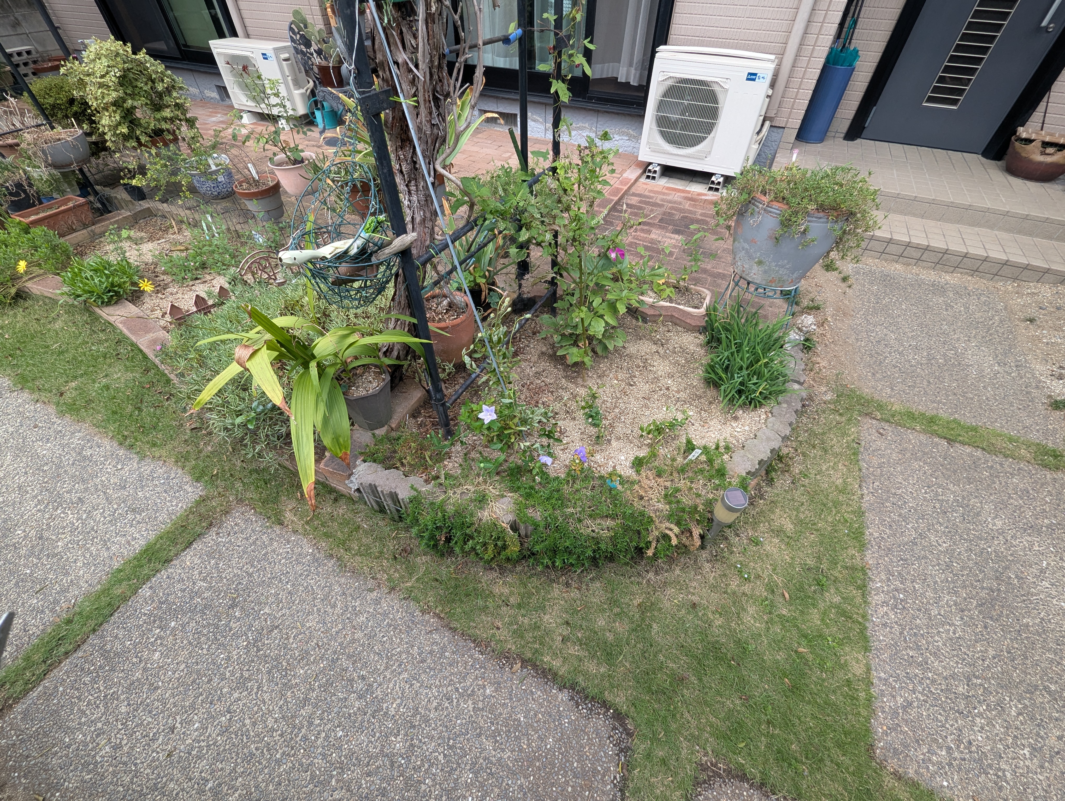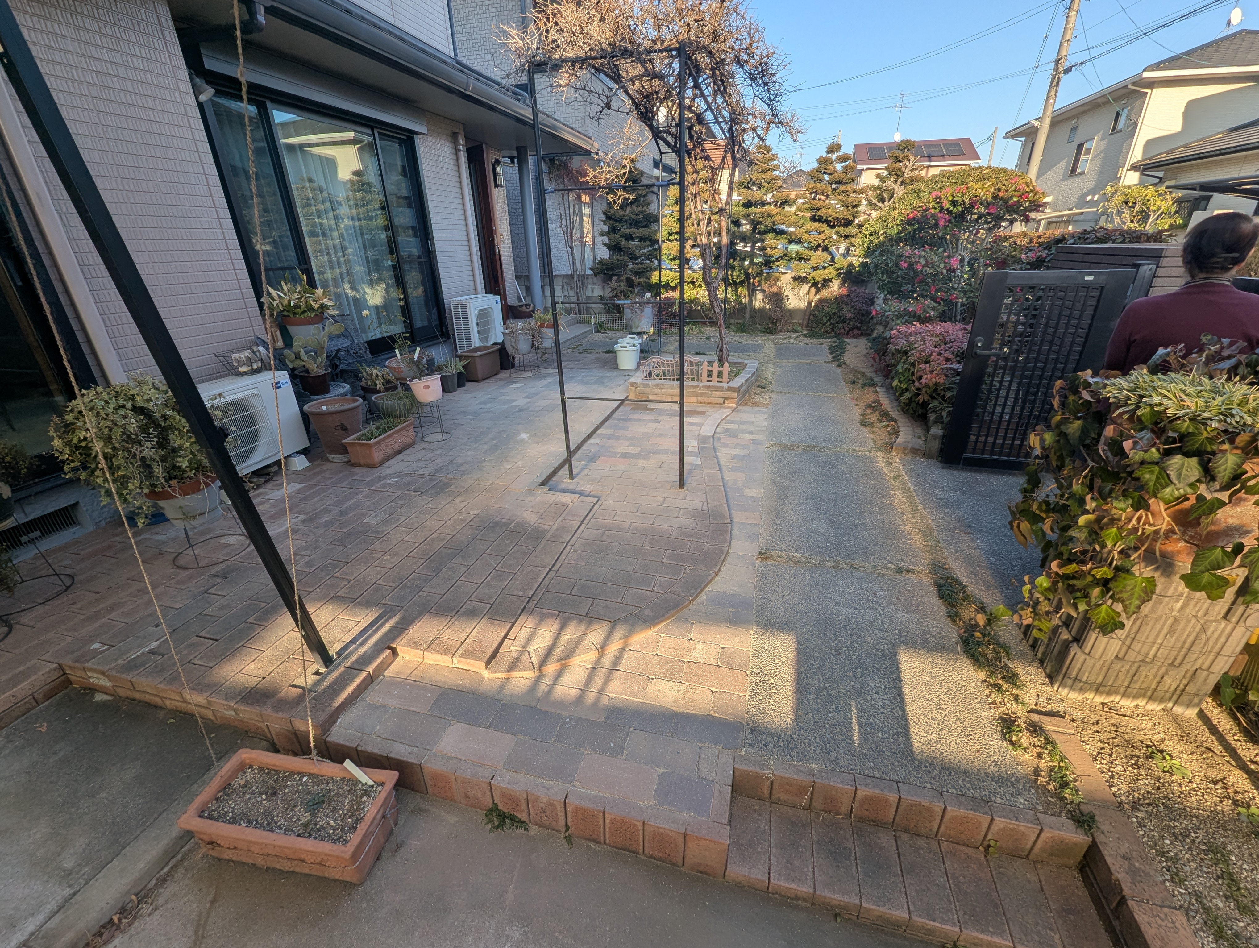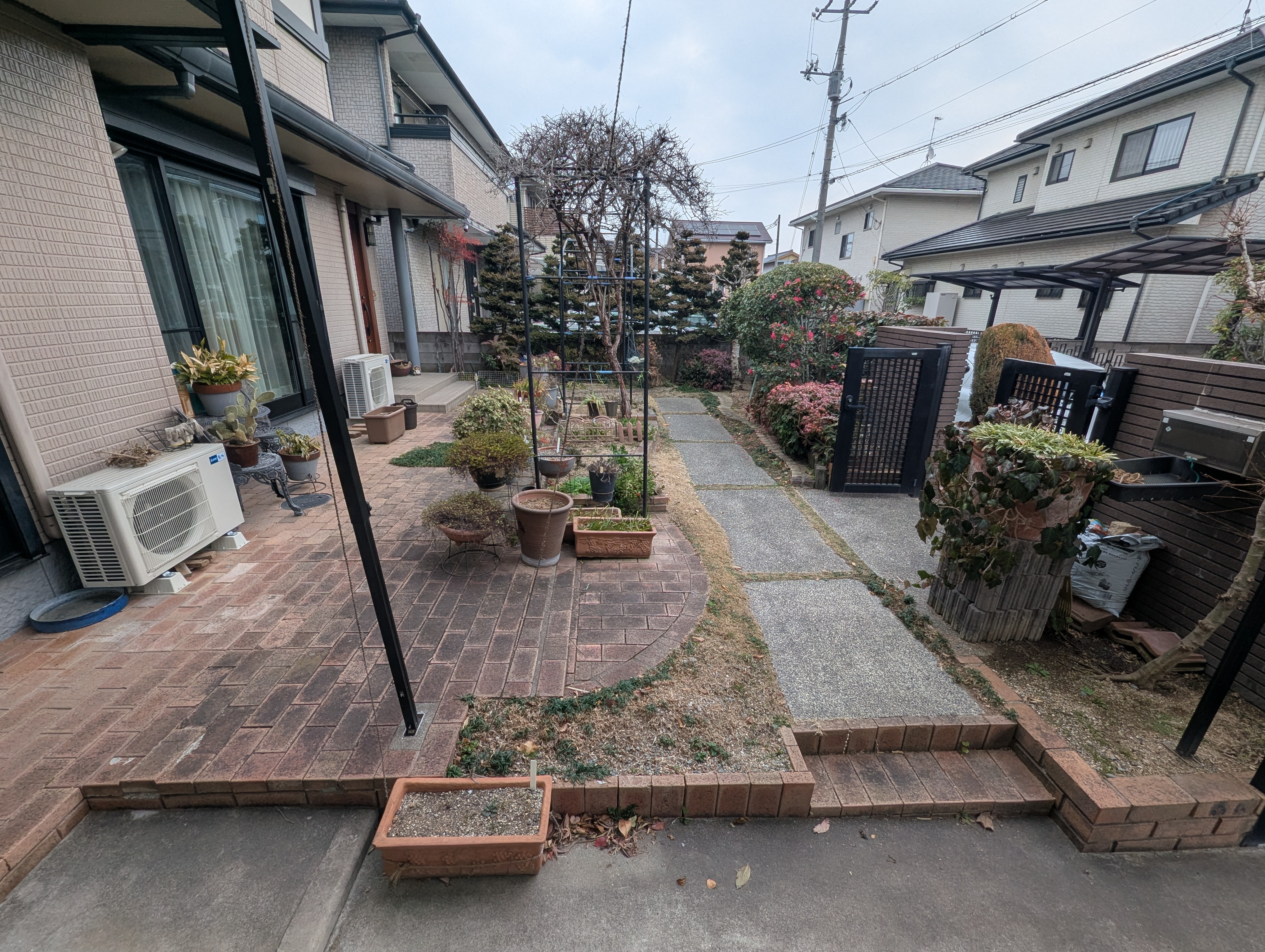 現状の庭をスッキリさせて、芝生部分にもレンガを敷きたいとのご要望を頂きました。花壇・植木・アーチパイプの撤去、レンガの新設と既存レンガの敷き直しを施工させて頂きました。
